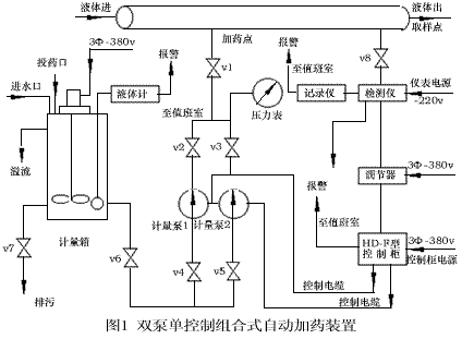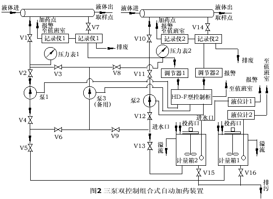 在電力、石油、化工、冶金工業(yè)、環(huán)境工程、水處理等領(lǐng)域中常需要將某種液體連續(xù)自動地注入到另一種液體中成為一種混合液,或者使加入的藥劑與液體中存在的某種組分發(fā)生化學(xué)反應(yīng),以達到預(yù)期的工藝要求。為達到最佳效果,在工況變化的情況下,對所加化學(xué)藥劑量自動跟蹤調(diào)節(jié)控制加藥速度,因此在這種裝置中我們采用了先進的自動控制方式來控制加藥量。這種加藥裝置結(jié)構(gòu)簡單、安裝方便。它主要由計量箱(藥劑貯罐)、計量泵(加藥泵)、自動控制系統(tǒng)、連接管路等組成。除部分加藥管路、取樣管路和加藥濃度檢測儀表這些設(shè)備一般都集中安裝在一個加藥間內(nèi), 自動加藥裝置將計量箱、計量泵、自動控制系統(tǒng)一體化,即安裝在一個底座上。制造廠完成設(shè)備購置、制造、組裝、調(diào)試、試運行,用戶只需將組合式自動加藥裝置安放在加藥間后,將計量泵出口與加藥管路、計量箱進出口與進水管等連接好,并將控制柜電源和檢測儀表信號送到控制柜就可以起動、投入運行。這樣可以大大減少現(xiàn)場施工工作量,避免了中間環(huán)節(jié)繁多引出的差錯以及相互間的扯皮,有效地保證工期和工程質(zhì)量,減少用戶的麻煩和損失。