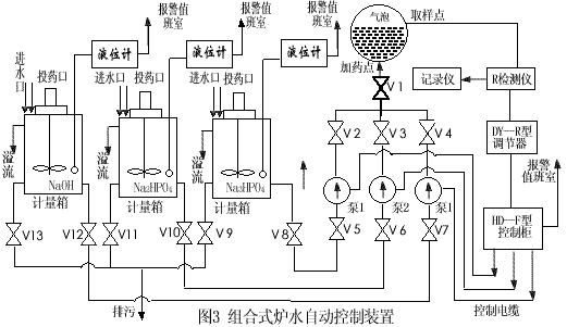 本裝置是用于鍋爐水協(xié)調(diào)磷酸鹽處理(控制爐水R值)的自動加藥裝置。該裝置由三個計量箱、三臺計量泵、一套交流變頻式R值自動控制系統(tǒng)、連接管路、閥門、底座等組成, 三個計量箱容積均為1立方米,分別貯存磷酸三鈉、磷酸氫二鈉、氫氧化鈉。 交流變頻式R值自動控制系統(tǒng)包括R值分析儀,動加藥控制柜。交流變頻式自動加藥控制柜。