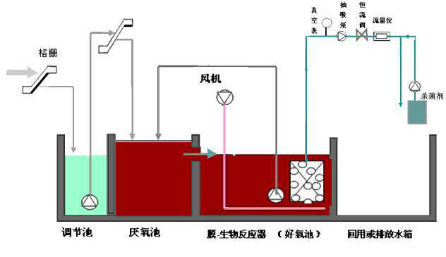 三、MBR膜生物反應(yīng)器組成 1、進(jìn)水井:進(jìn)水井里設(shè)置溢流口和進(jìn)水閘門,在來水量超過系統(tǒng)負(fù)荷或者處理系統(tǒng)發(fā)生事故的情況下,關(guān)閉進(jìn)水閘門,污水直接通過溢流口就近排入河道或者市政管網(wǎng)。 2、格柵:污水中經(jīng)常含有大量雜物,為了保證MBR系統(tǒng)的正常運(yùn)行,必須將各種纖維、渣物、廢紙等雜物攔截在系統(tǒng)之外,因此在系統(tǒng)前設(shè)置格柵,定期將柵渣清理干凈。 3、調(diào)節(jié)池:收集的污水水量和水質(zhì)都是隨著時(shí)間變化的,為了保證后續(xù)處理系統(tǒng)的正常運(yùn)行,降低運(yùn)行負(fù)荷,需要對(duì)污水的水量和水質(zhì)進(jìn)行調(diào)解,因此在進(jìn)入生物處理系統(tǒng)前設(shè)計(jì)調(diào)節(jié)池。調(diào)節(jié)池內(nèi)需要定期清理沉淀物。調(diào)節(jié)池一般設(shè)置溢流,在負(fù)荷過大的情況下,保證系統(tǒng)的運(yùn)行正常。 4、毛發(fā)聚集器:在中水處理系統(tǒng)內(nèi),由于收集的洗浴廢水內(nèi)含有少量的毛發(fā)和纖維,不清理干凈,會(huì)對(duì)水泵和MBR反應(yīng)器造成堵塞,降低處理效率,并可能最終造成整個(gè)系統(tǒng)的癱瘓,因此在中水處理系統(tǒng)內(nèi)需要設(shè)置毛發(fā)過濾器。 5、MBR反應(yīng)池:在MBR反應(yīng)池里進(jìn)行著有機(jī)污染物的降解和泥水的分離。作為處理系統(tǒng)的核心部分,反應(yīng)池里面包括微生物菌落、膜組件、集水系統(tǒng)、出水系統(tǒng)、曝氣系統(tǒng)。 6、消毒裝置:根據(jù)出水的要求,系統(tǒng)設(shè)計(jì)有消毒裝置,可自動(dòng)控制加藥量。 7、計(jì)量裝置:為了能夠保證系統(tǒng)運(yùn)行良好,需要采用一定的計(jì)量裝置進(jìn)行系統(tǒng)的參數(shù)控制。計(jì)量控制儀器包括流量計(jì)和水表等。 8、電控裝置:電控箱安裝于設(shè)備機(jī)房?jī)?nèi)。主要控制進(jìn)水泵、風(fēng)機(jī)和抽吸泵。控制有手動(dòng)控制和自動(dòng)控制兩種形式。進(jìn)水泵在PLC控制下,根據(jù)各反應(yīng)池水位情況,自動(dòng)運(yùn)行。抽吸泵運(yùn)行按預(yù)設(shè)時(shí)間周期間歇控制,當(dāng)MBR反應(yīng)池低水位時(shí),抽吸泵自動(dòng)停止,以保護(hù)膜組器。 四、膜生物反應(yīng)器特點(diǎn) • 由于膜的分離作用,不必設(shè)立沉淀、過濾等其他固液分離設(shè)備。高效的固液分離將廢水中的懸浮物質(zhì)、膠體物質(zhì)、生物單元流失的微生物菌群與已凈化的水分開,不須經(jīng)三級(jí)處理即直接可回用。投資省費(fèi)用低。 • 可使生物處理單元內(nèi)生物量維持在高濃度,使容積負(fù)荷大大提高,同時(shí)膜分離的高效性,使處理單元水力停留時(shí)間大大縮短,生物反應(yīng)器的占地面積減少。系統(tǒng)占地僅為傳統(tǒng)方法的三分之一。 • 膜生物反應(yīng)器可以濾除細(xì)菌、病毒等有害物質(zhì),可顯著節(jié)省加藥消毒所帶來的長(zhǎng)期運(yùn)行費(fèi)用并擴(kuò)大廢水回用范圍。 • 膜的高效截流作用,使微生物完全截留在反應(yīng)器內(nèi),實(shí)現(xiàn)反應(yīng)器水力停留時(shí)間(HRT)和污泥齡(STR)的完全分離,運(yùn)行控制靈活穩(wěn)定。 • 防止各種微生物菌群的流失,有利于生長(zhǎng)速度緩慢的細(xì)菌(硝化細(xì)菌等)的生長(zhǎng),使一些大分子難降解有機(jī)物的停留時(shí)間變長(zhǎng),有利于它們的分解,從而使系統(tǒng)中各種代謝過程順利進(jìn)行。系統(tǒng)抗沖擊性強(qiáng),適應(yīng)范圍廣。 • 膜生物反應(yīng)器內(nèi)生物污泥在運(yùn)行中可以達(dá)到動(dòng)態(tài)平衡,幾乎無剩余污泥排放,污泥處理費(fèi)用低。 • 不需反沖洗,流程簡(jiǎn)單,易于集成。獨(dú)特的運(yùn)行方式,使膜表面不易堵塞,洗膜間隔時(shí)間長(zhǎng),且洗膜方式簡(jiǎn)單易行,使水處理所需能耗很低。 五、出水水質(zhì)參考