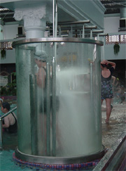 沖擊保養泉 利用自高處往下沖之動力水柱,沖擊上半身之頭、頸、肩、背部,進行強力按摩,藉以消除全身緊張性。消除肩、頸酸痛不適,并減輕偏頭癥,松馳上半身筋骨與消除疲勞。 |