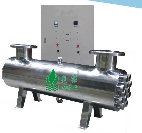由金屬腔體、帶石英套管的紫外燈、系統控制柜、紫外線強度檢測儀、手動/全自動清洗系統組成。 腔體用不銹鋼制造,內壁作拋光處理以提高對紫外線的反射能力和增強輻射強度。設備選型時根據水量的大小和進水水質指標確定紫外燈管的數量,在紫外消毒腔里還增加專用設備以改變水流的狀態保證腔體中水流所照射的紫外線劑量均勻,提高消毒效果。 電控系統:啟動和監控紫外燈運行。可根據客戶需要配置各種先進的在線監控儀表和遠程控制系統。 清洗裝置:可根據客戶需要配置機械式手動或自動清洗紫外C燈管裝置。 設備安裝:基座固定,直接串連于進、出水管道之間,采用法蘭盤或螺紋連接。 進出水管口徑和方向可根據用戶要求生產。