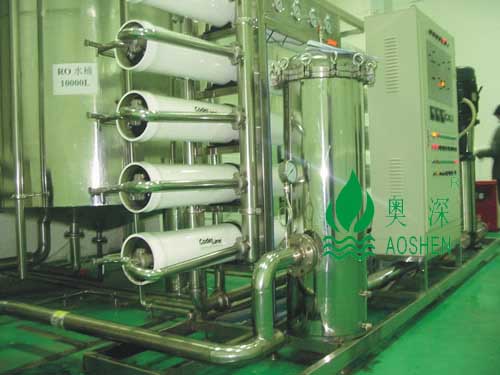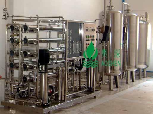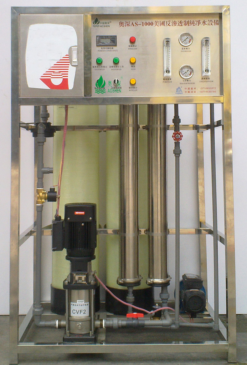 7、高壓泵 采用立式多級不銹鋼離心高壓泵,這是RO 主機(jī)的一個(gè)重要組件,它的作用是給反滲透膜輸送一定數(shù)量一定壓力的水源。其品質(zhì)的好壞對整機(jī)的影響很大。使用中應(yīng)保證不得空轉(zhuǎn),不得長期超負(fù)荷運(yùn)行,經(jīng)常按要求排除空氣,應(yīng)保證電器部件的干燥。 8、一級反滲透系統(tǒng) 反滲透裝置是用足夠的壓力使溶液中的溶劑(一般是水)通過反滲透膜(或稱半透膜)而分離出來,因?yàn)檫@個(gè)過程和自然滲透的方向相反,因此稱為反滲透。 反滲透法能適應(yīng)各類含鹽量的原水,尤其是在高含鹽量的水處理工程中,對有機(jī)物和無機(jī)物的去除率達(dá)到99%。使水中的不純物質(zhì)如:熱原、細(xì)菌、病毒、化合物等有害物質(zhì)被隔離在膜的一邊,與水分子分離。能獲得很好的技術(shù)經(jīng)濟(jì)效益。反滲透法的脫鹽率提高,回收率高,運(yùn)行穩(wěn)定,占地面積小,操作簡便,反滲透設(shè)備在除鹽的同時(shí),也將大部分細(xì)菌、膠體及大分子量的有機(jī)物去除。 9、半成品水箱(可選) 儲存未經(jīng)消毒的純凈水。 10、臭氧、紫外線殺菌器 采用臭氧殺滅水中的細(xì)菌和病毒,防止水箱器有新的細(xì)菌產(chǎn)生,徹底保證純凈水水質(zhì)。